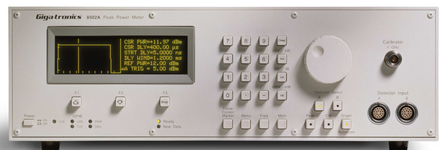 - Giga品牌8500A係列功率計產品結合了連續波功率測量能力以及精準的峰值功率測量能力,用戶可以用單一設備對連續波以及脈衝調製波形進行測量分析,同時儀器還可以提供如上升、下降時間以及脈衝寬帶等參數的顯示,產品具有單通道和雙通道兩個具體版本,在使用時需要配備對應的功率探頭。